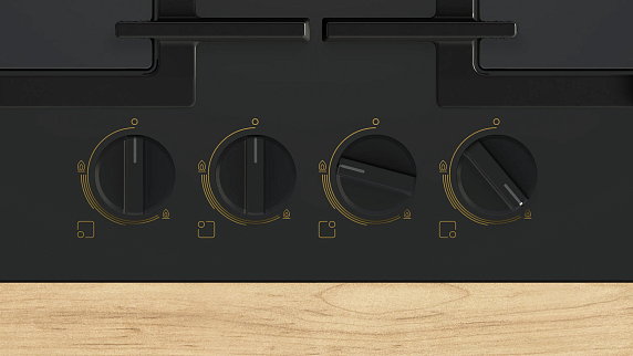 Управление реализовано с помощью поворотных регуляторов, удобных и интуитивно понятных при готовке; они позволяют быстро менять интенсивность пламени и подстраивать температуру под разные технологии приготовления. Наличие функции FlameSelect упрощает выбор величины огня: предусмотрено 9 устойчивых ступеней мощности, которые дают точные переходы между режимами и удобны при деликатной термообработке. Для быстрого и надёжного розжига используется автоматический электроподжиг, а система газ-контроля с термоэлектрической защитой блокирует подачу топлива при затухании пламени, повышая безопасность эксплуатации. Общая суммарная мощность конфорок составляет 7.5 кВт, при этом отдельные горелки имеют распределение мощности: передняя левая — 1.75 кВт, задняя левая — 1.75 кВт, передняя правая — 1.00 кВт, задняя правая — 3.00 кВт, что обеспечивает баланс между быстрым закипанием и энергоэффективным томлением на малом огне.