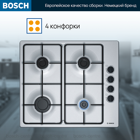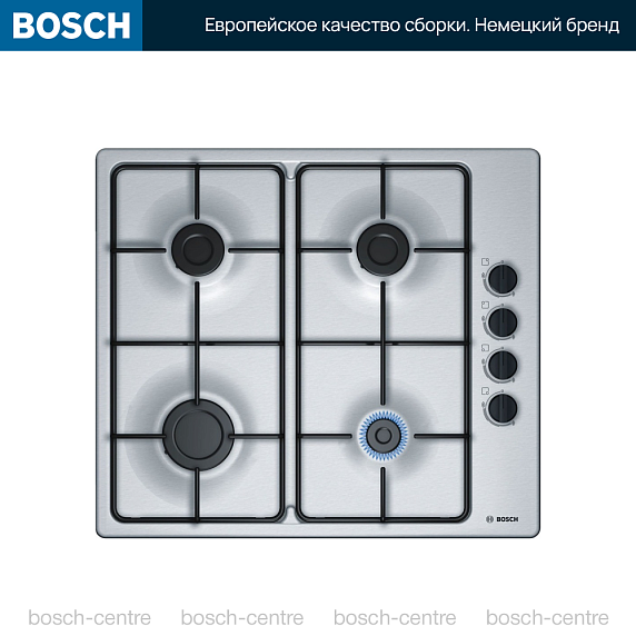 Газовая варочная панель Bosch PBP6B5B80 на 4 конфорки, шириной 58 см, нержавеющая сталь