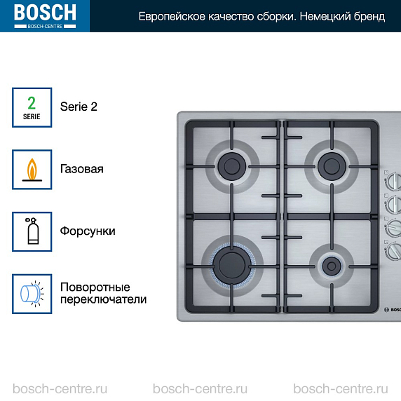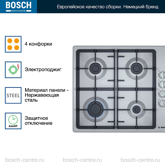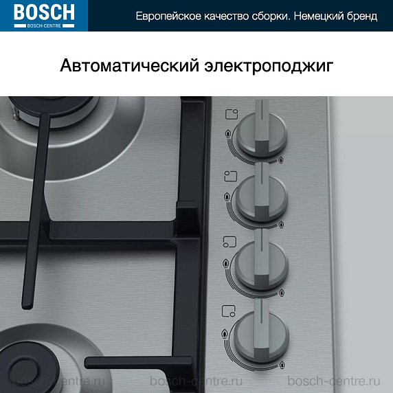 Газовая варочная панель Bosch PBP6C5B93R на 4 конфорки, шириной 58 см, нержавеющая сталь