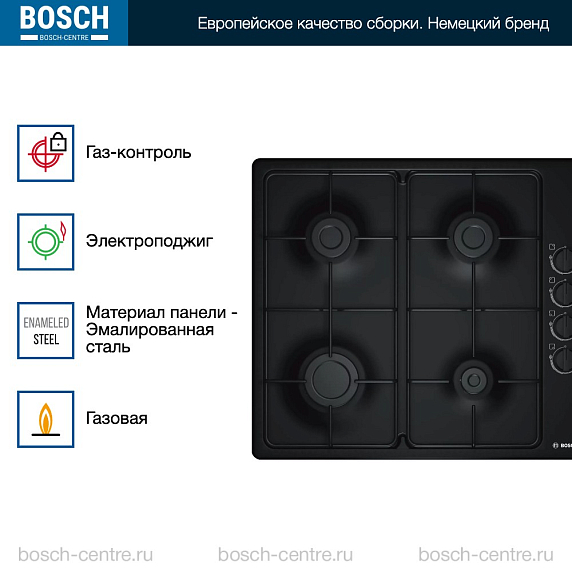 Газовая варочная панель Bosch PBP6C6B82Q на 4 конфорки, шириной 58 см, черный