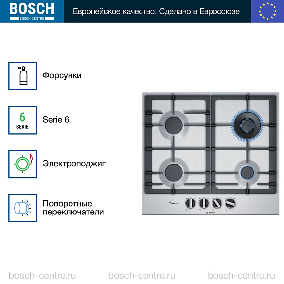 Газовая варочная панель Bosch PCH6A5B90R на 4 конфорки, шириной 58.2 см, нержавеющая сталь
