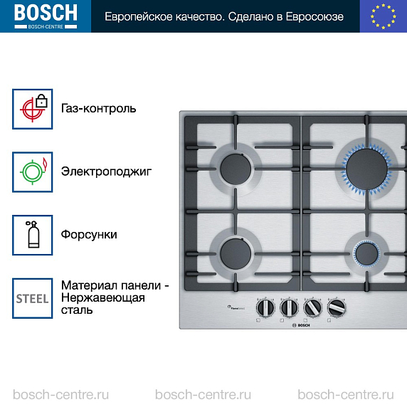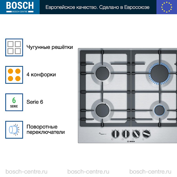 Газовая варочная панель Bosch PCP 6A5B90R на 4 конфорки, шириной 58.2 см, нержавеющая сталь