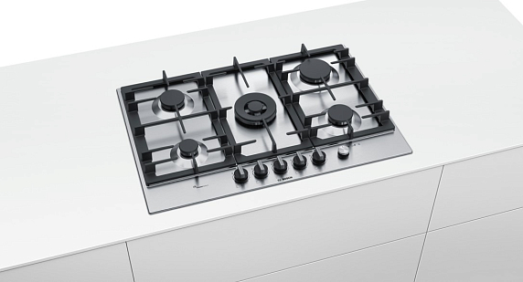 Газовая варочная панель Bosch PCQ7A5M90R на 5 конфорки, шириной 75 см, нержавеющая сталь