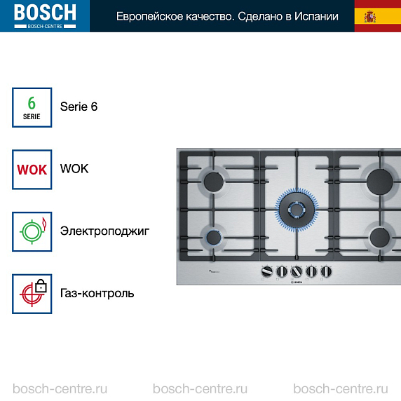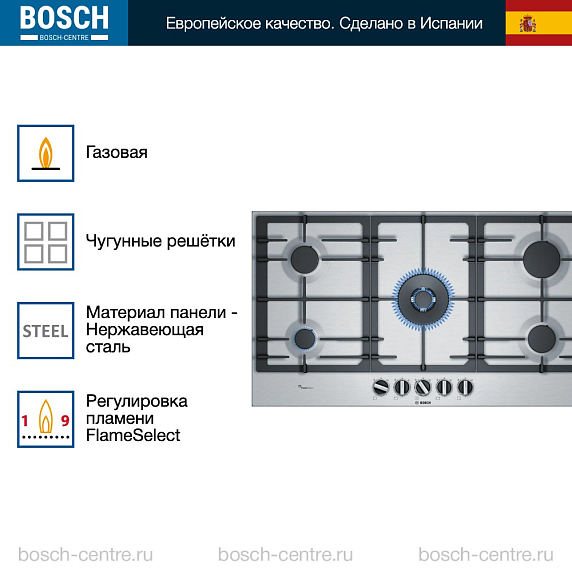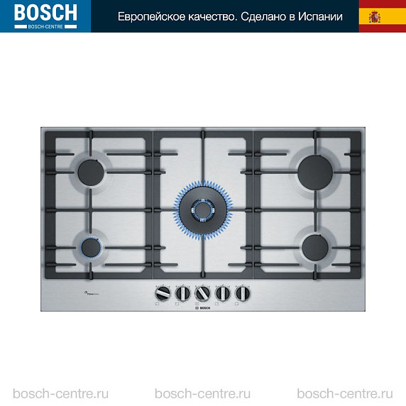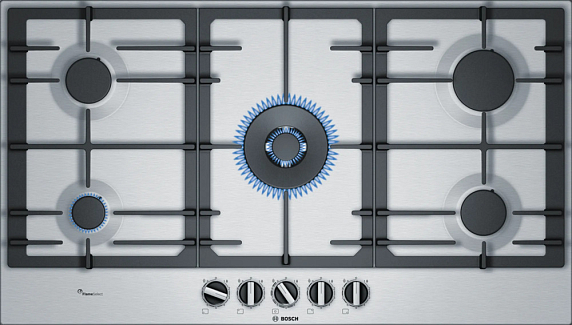 Газовая варочная панель Bosch PCR9A5B90M на 5 конфорки, шириной 91.5 см, нержавеющая сталь