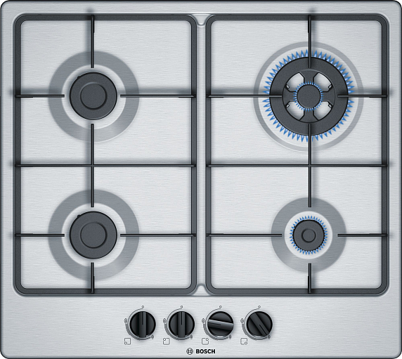 Газовая варочная панель Bosch PGH6B5B60 на 4 конфорки, шириной 58.2 см, нержавеющая сталь