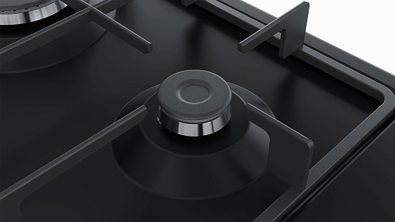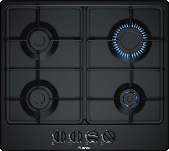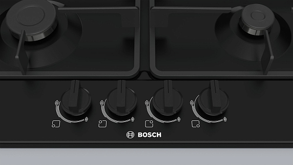 Варочная панель Bosch PGP6B6B60 — модель в черном цвете с четырьмя газовыми горелками, одна из которых повышенной мощностью, одна экономичная и две стандартных. Чугунные составные решетки легко снимать для мытья. Поворотные переключатели расположены спереди. От утечки предусмотрена термоэлектрическая защита, при затухании огня система перекрывает подачу газа.