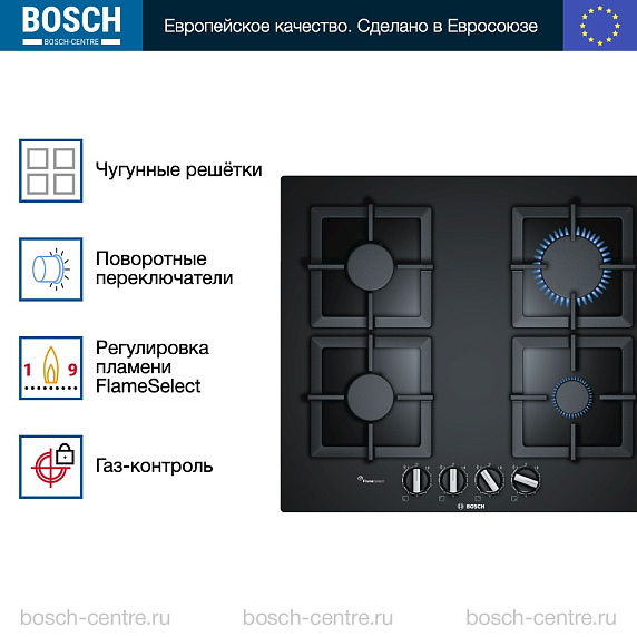 Варочная панель Bosch PPP 6A6B20 выполнена из закаленного стекла. Чугунные решетки обеспечат прекрасную устойчивость любой посуды. Защита от утечки перекрывает подачу газа, если пламя внезапно потухло.