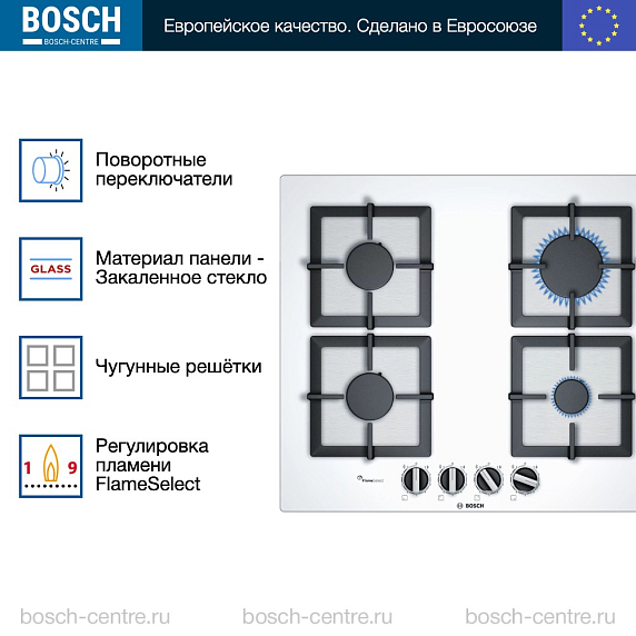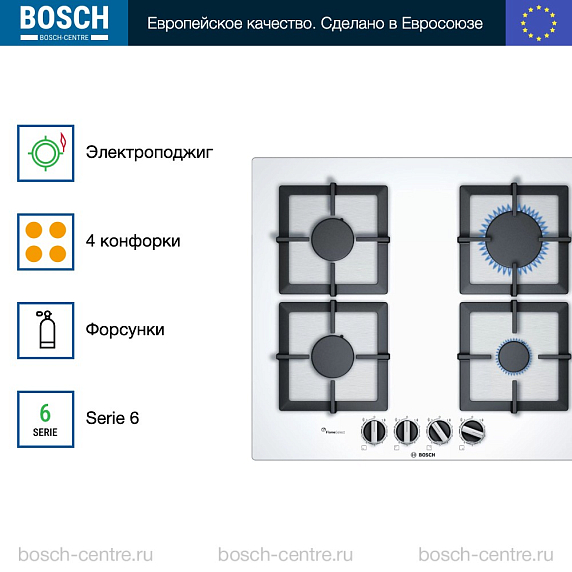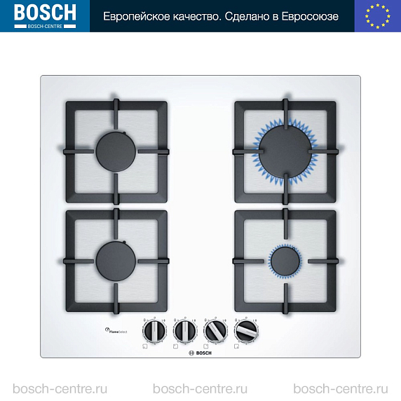 Газовая варочная панель Bosch PPP6A2B20O на 4 конфорки, шириной 59 см, белый