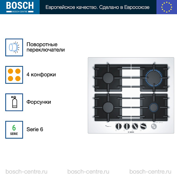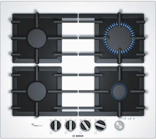 Газовая варочная панель Bosch PPP6A2M90R на 4 конфорки, шириной 59 см, белый