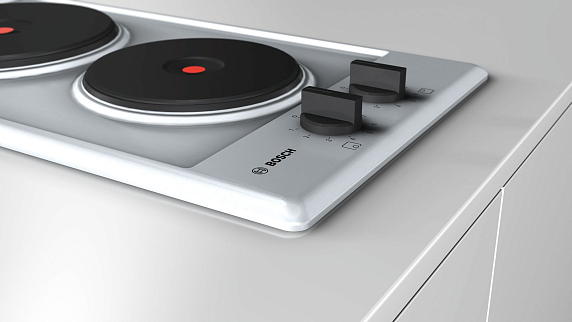 Варочная панель с двумя мощными зонами нагрева PEE389CF1 может быть встроена рядом с другим варио-прибором. Поверхность выполнена из гладкой хромоникелевой стали 18/10, поэтому за ней легко ухаживать. При использовании специального масла Bosch для полировки или других средств на нержавейке образуется специальный защитный слой, к которому не прикипают даже жирные капли. Поверхность надолго сохранит опрятный вид. Чугунные конфорки быстро нагреваются и надолго сохраняют тепло, блюда можно оставлять для подогрева.
