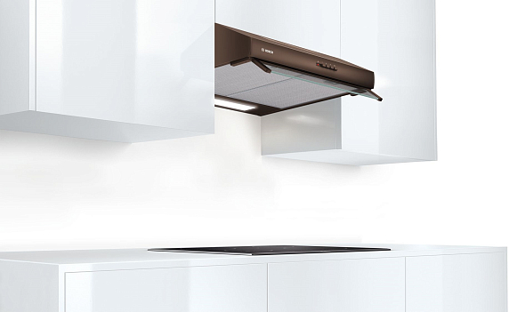 Вытяжка Bosch DUL63CC40 — модель коричневого цвета отлично подойдет для небольшой кухни. Прибор крепится к стене или может быть встроен в подвесной шкаф. При компактных размерах имеет довольно высокую производительность до 350 м3/ч, что гарантирует быструю очистку воздуха от запахов и загрязнений.