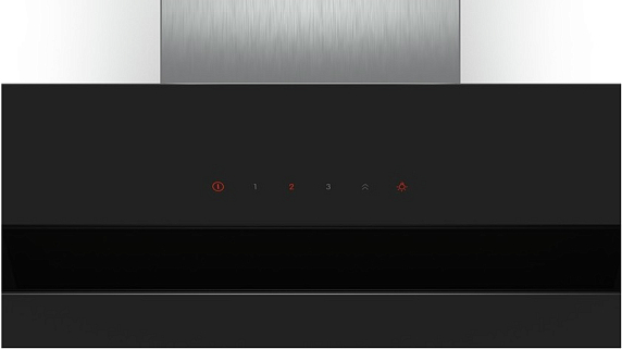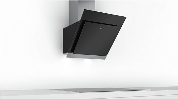 Наклонная вытяжка Bosch DWK 67HM60 эффектно смотрится в интерьере и удобна в использовании благодаря конструкции — передний край не перекрывает обзор. Забор воздуха производится по периметру прибора, что уменьшает уровень шума. Жировой фильтр закрыт стеклянным экраном. Сенсорное управление Touch Select расположено на передней панели, переключение скоростей и включение света производится легким касанием.