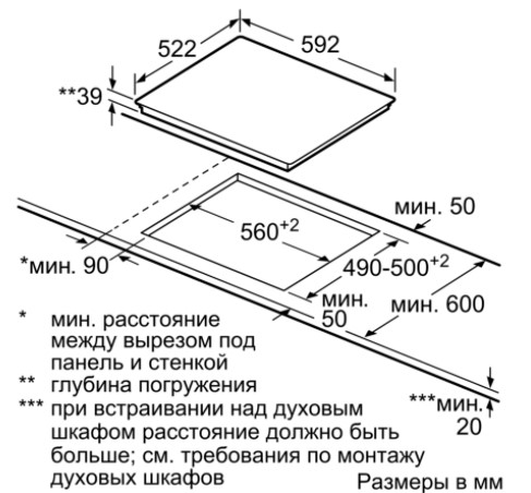 Схема встраивания для варочной панели Bosch PKF631B17E