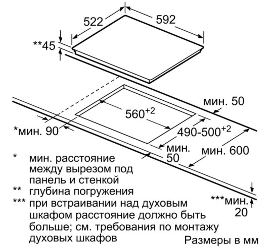 Схема встраивания для варочной панели Bosch PKF652BB1E