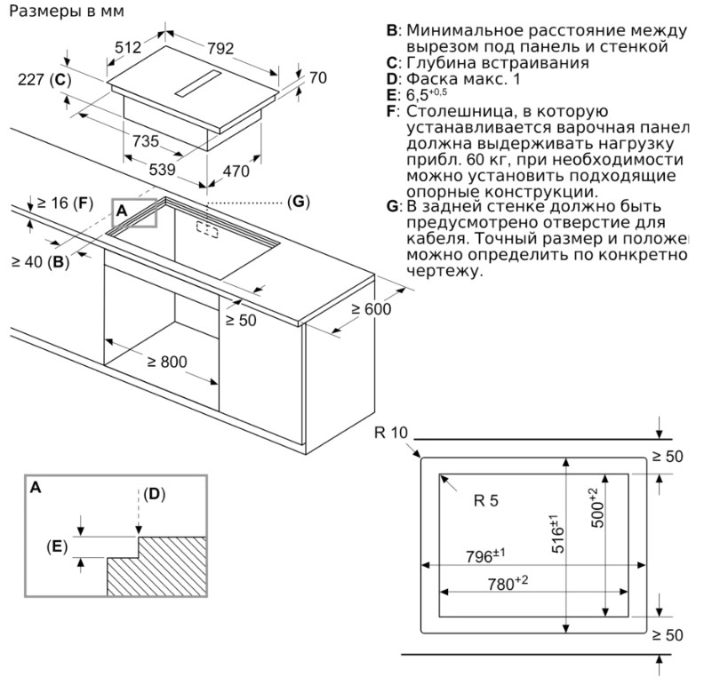 Схема встраивания 1 для варочной панели Bosch PXX821D66E