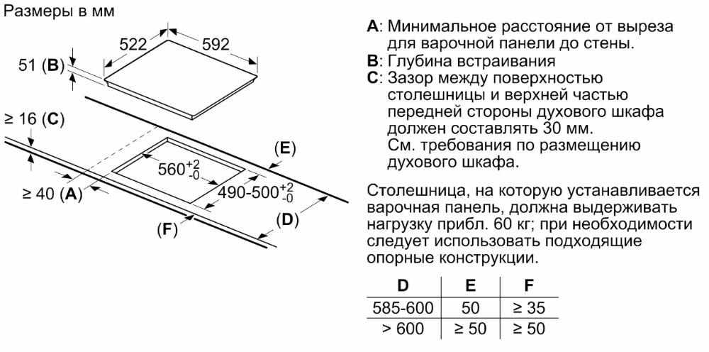 Схема встраивания 1 для варочной панели Bosch PUE61KBB5E