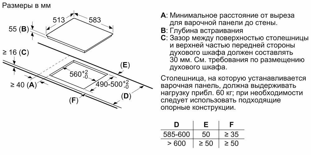 Схема встраивания для варочной панели Bosch PWP64RBB6E