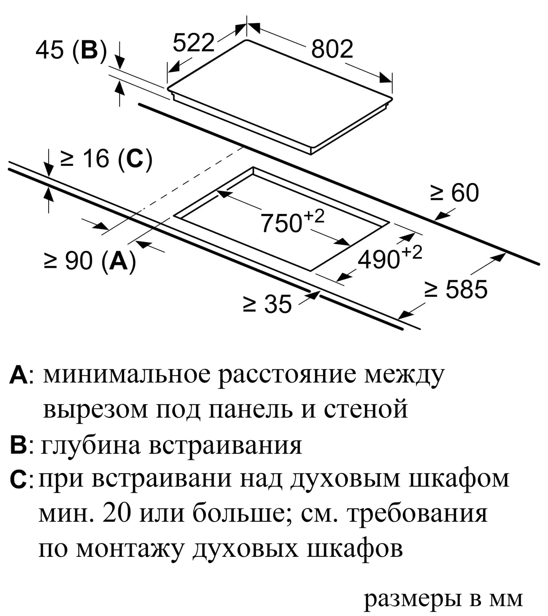 Схема встраивания для варочной панели Bosch PKN811FP1E