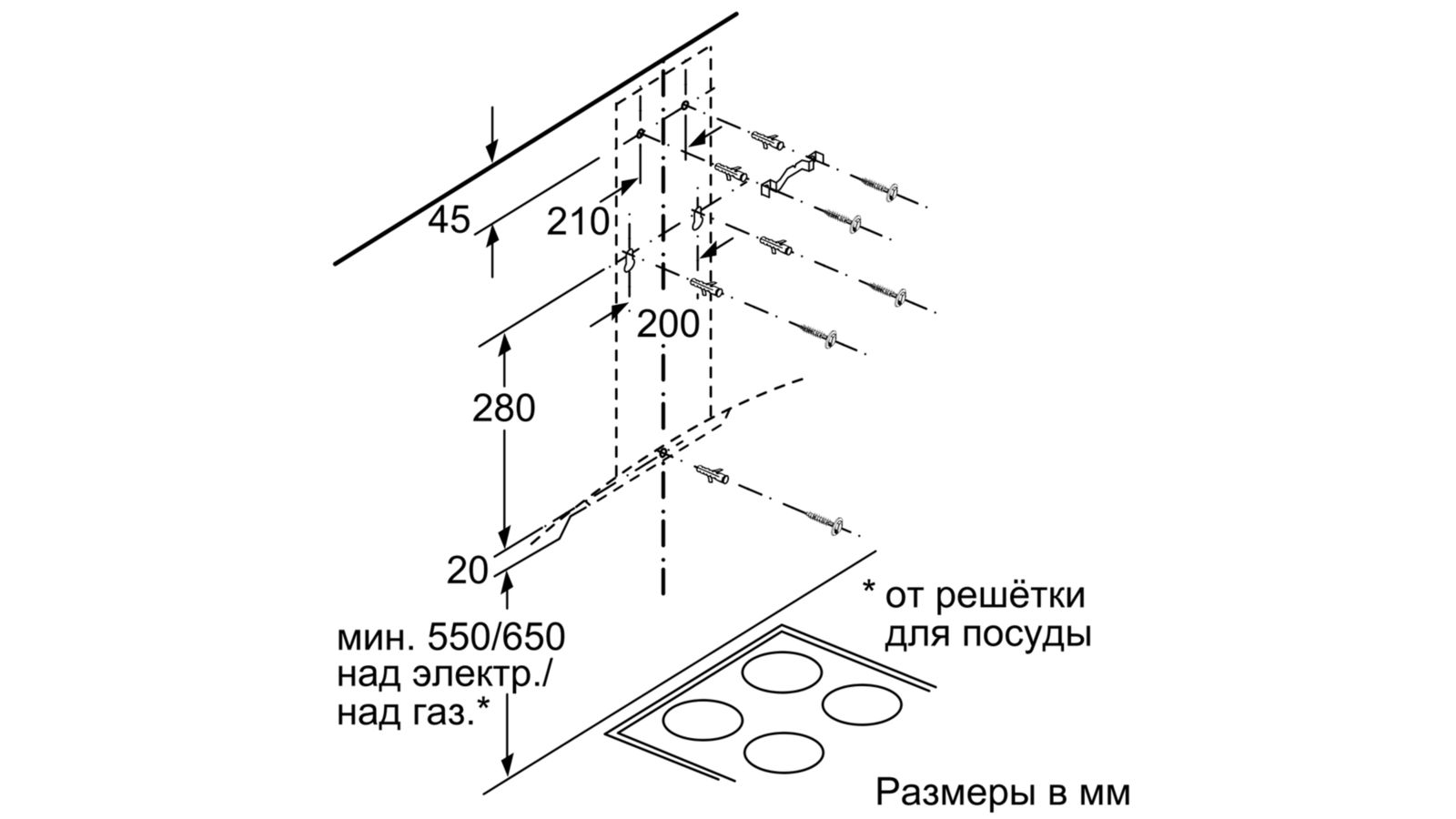 Схема встраивания 2 для кухонной вытяжки Bosch DWA96BC50