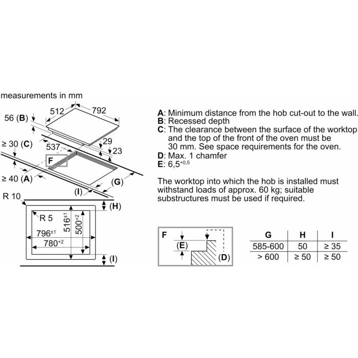 Схема встраивания для варочной панели Bosch PXE801DC1E