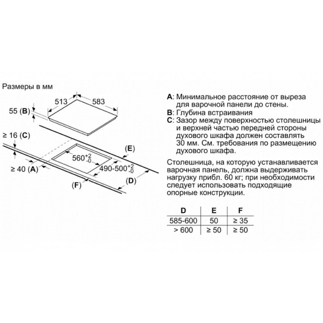 Схема встраивания 1 для варочной панели Bosch PIE645BB5E